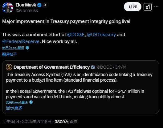 马斯克在转发美国政府效率部的贴文表示,“国库支付系统完整性迎来重大改进,现已正式上线!这是政府效率部、美国财政部和美联储三方通力合作的成果。大家都干得不错!“此前美国政府效率部发帖称,“财政部访问标识 (TAS) 是将国库支付与预算项目 (标准财务流程) 联系起来的识别码。在联邦政府中,过去约4.7万亿美元的支付中TAS字段是可选项,且经常留空,使得追溯几乎不可能。自上周六起,该字段已成为必填项,可以更深入地了解资金的实际去向。感谢美国财政部所做的出色工作。”