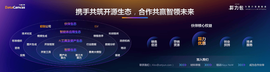 发布会上,九章云极DataCanvas公司应用发展中心总经理景越宣布这一成果,并详尽阐述和形象演示“算力包”产品、Alaya NeW Cloud智算专有云服务以及Alaya NeW智算操作系统是如何完成“算力+算法”组合拳,实现一体化算力服务的。