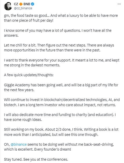 币安创始人赵长鹏获释后首发声,称将进行更多科技投资