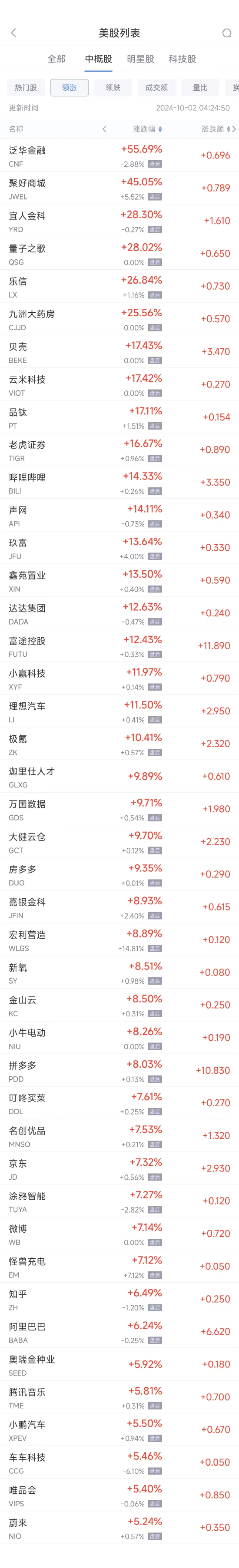 上涨股当中(按市值降序排列),阿里巴巴涨6.24%,拼多多涨8.03%,京东涨7.33%,网易涨3.35%,携程涨5.18%,百度涨4.74%,理想汽车涨11.50%,贝壳涨17.43%,百济神州涨2.88%,腾讯音乐涨5.81%,中通涨2.54%,富途控股涨12.43%,蔚来涨5.24%,新东方涨1.78%,小鹏汽车涨5.50%,华住酒店集团涨4.46%,哔哩哔哩涨14.33%,满帮涨3.22%,唯品会涨5.40%,BOSS直聘涨3.92%。