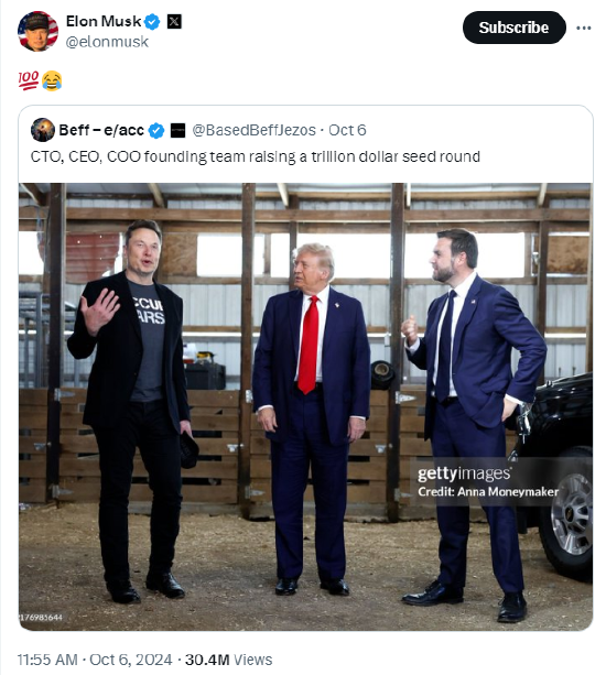 有X网友发帖,晒出特朗普、万斯、马斯克三人在巴特勒集会时的合影,并配文“CTO(马斯克)、CEO(特朗普)、COO(万斯)创始团队正进行1万亿美元的种子轮融资”。马斯克转发该推文,并评论道“100分”。