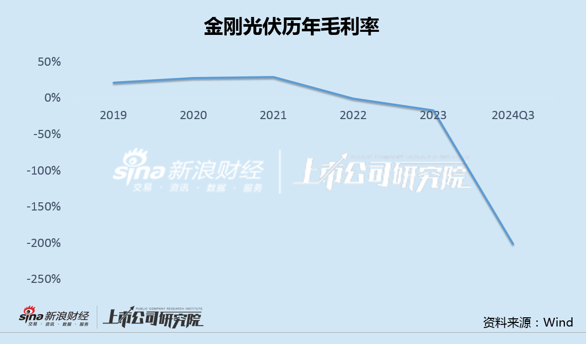 今年前三季度,金刚光伏营业收入7924.70万元,同比下降80.22%,实现归母净利润-3.51亿元,同比增亏102.63%。随着收入规模的骤降,毛利率暴跌至-201%的历史低位。