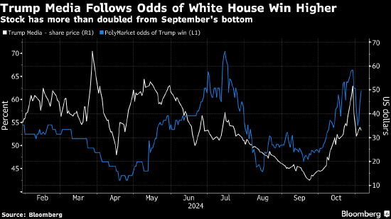 大体追踪选举博彩市场的Trump Media近月来波动十分剧烈。在特朗普7月于宾州遭遇刺杀后该股股价飙升。哈里斯接棒参选并缩小了与共和党对手的民调差距后,股价又重挫。在过去八个交易日里,该股有七次出现两位数的波动幅度。